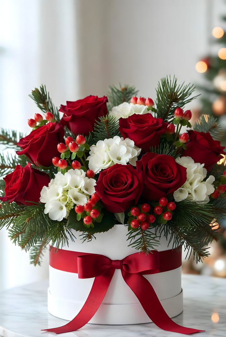 “Navidad en Rojo” combina la intensidad de las rosas rojas con la pureza de las flores blancas, acentuadas por follaje verde tipo pino y delicadas bayas rojas que evocan calidez y celebración. Presentado en una elegante caja blanca con lazo rojo, este diseño transmite elegancia clásica y encanto navideño.