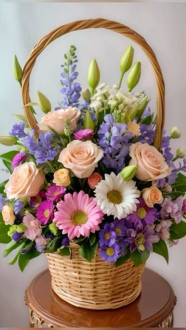 “Primavera Encantada” combina rosas en tono durazno con margaritas, flores lilas y delicados capullos que aportan movimiento y frescura. La mezcla de colores pastel crea una armonía luminosa y natural, mientras la canasta clásica realza su estilo tradicional y acogedor.