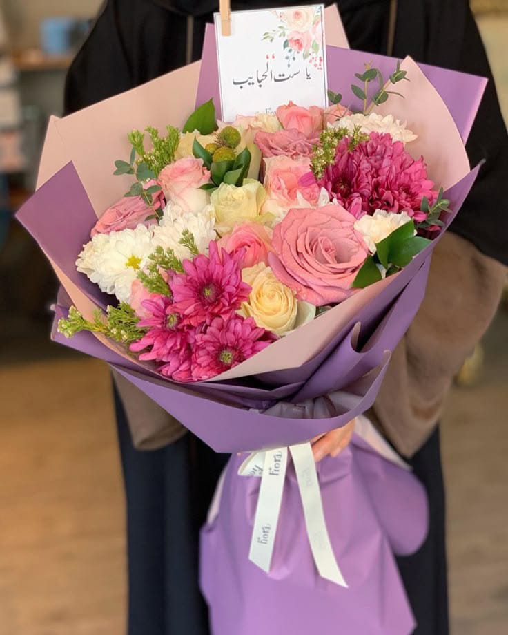 “Elegancia en Flor” reúne rosas en tonos rosados y crema, crisantemos vibrantes y flores de temporada que aportan textura y profundidad, envueltas en un delicado papel lila que realza su belleza natural.