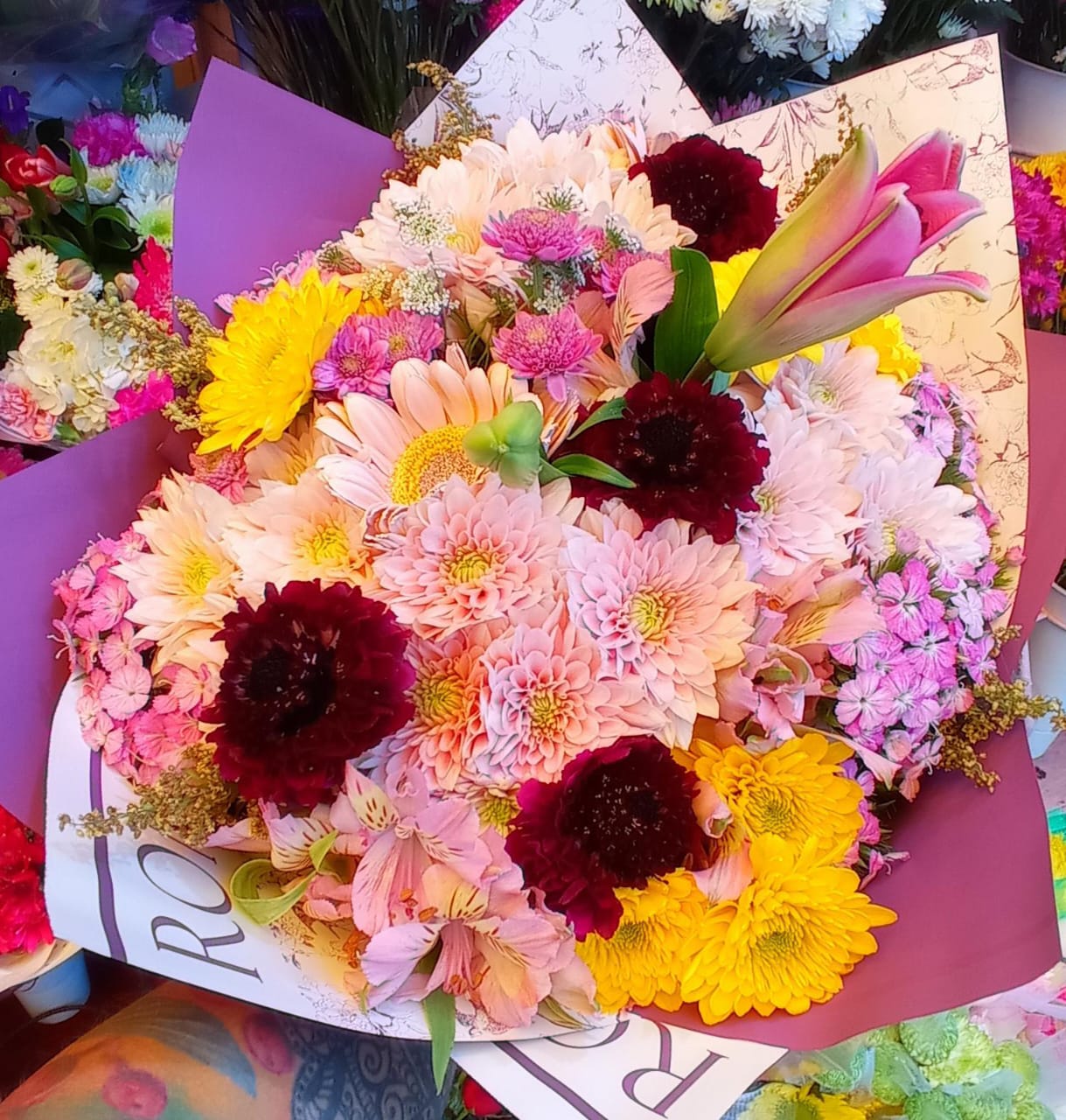 “Jardín Abundante” reúne una selección generosa de flores frescas en tonos rosados, amarillos, borgoña y suaves matices pastel. Crisantemos llenos de textura, flores delicadas y toques vibrantes se combinan para crear una composición rica, armoniosa y profundamente alegre.